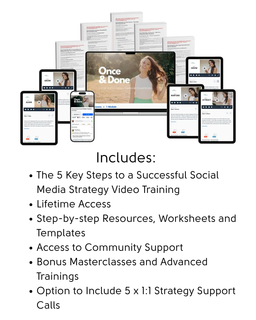 Because this is a DIY program, it would be beneficial if you have a strong level of social media and marketing experience and looking to follow a sustainable strategy. If not, I recommend considering my 6 month coaching program, 'Once & Done Social Media Freedom Formula'. As this is a simpler DIY 'framework' version of my main program.