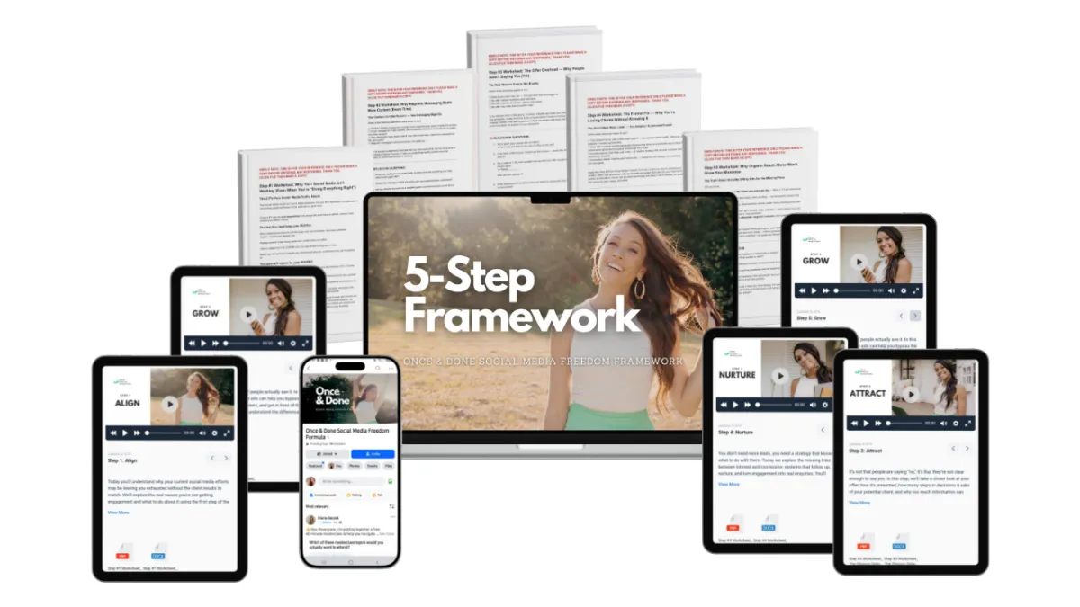 This is the simplified and short version of the system I teach inside my 6-month coaching program Once & Done Social Media Freedom Formula designed to help you understand what’s missing in your current strategy and how to build one that supports your goals, your time, and your business model.